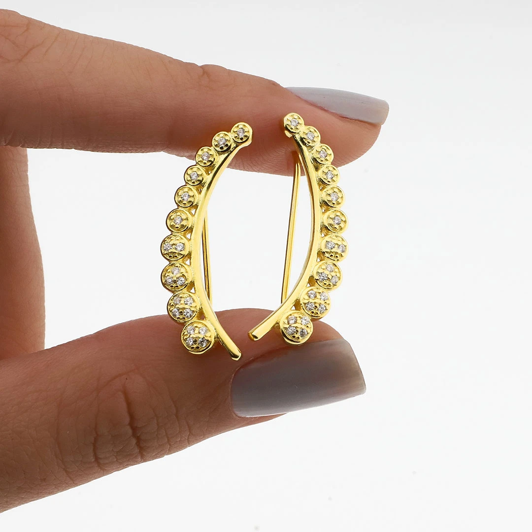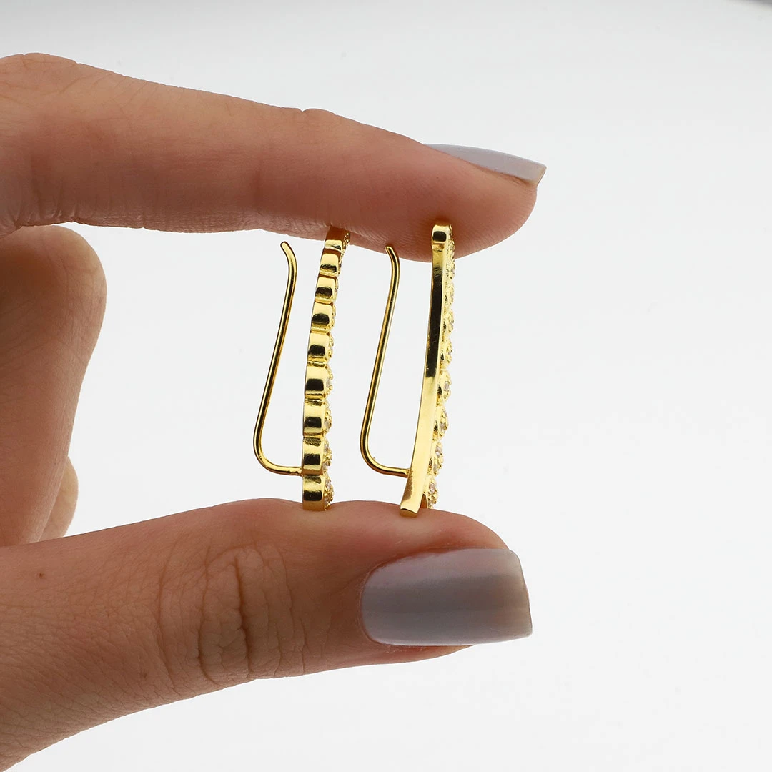 Deja que tus orejas hablen de estilo con estos impresionantes trepadores bañados en oro. Su diseño escalonado y meticulosamente detallado crea un efecto visual fascinante, mientras los cristales relucientes añaden un toque de encanto y distinción a tus outfits.